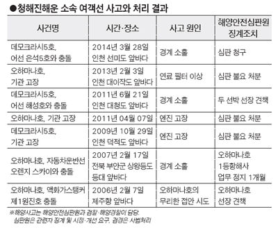 清海鎮(チョンヘジン)海運所属船舶で事故が相次いだが事故を調査・審判する審判院の懲戒は毒にも薬にもならなかった。審判院は「原因糾明と再発防止が本来の任務」として制裁には最初から手を離している。司法処理をしなければならない事故は検察と海洋警察が受け持っているが司法処理基準も緩いことこの上ない。