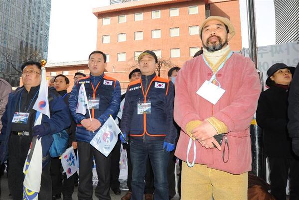 2月23日、島根県の「竹島の日」関連行事に抗議する集会に参加したキム・ギジョン容疑者(右手前)=ソウル(共同)