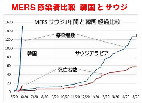 グラフ:MERS感染者数と死亡者数 韓国とサウジアラビアの比較(最初の1年間)