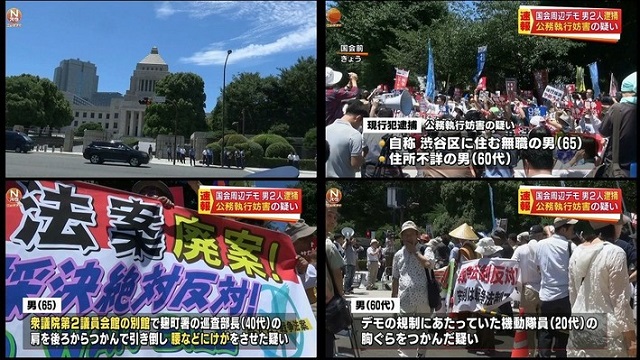 国会周辺にて安保反対デモ参加の60代男2人を公務執行妨害の疑いで逮捕 警備にあたっていた警察官に暴力を振るう *内一人は中核派