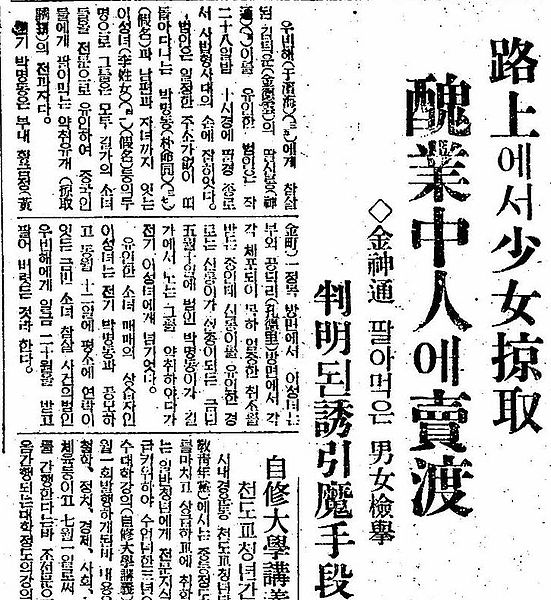 朝鮮人の人身売買組織が、誘拐した少女を中国人に売り飛ばしていた為、日本政府によって検挙されたことを報じる記事