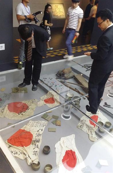 抗日戦争70年に関する展覧会。館内ではガラスの上から日の丸を踏みつけさせる仕掛けが施されていた(川越一撮影