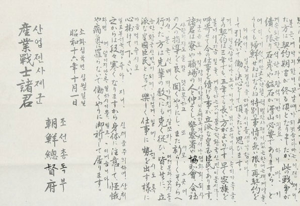 その契約は三年でも五年でも長い方がよいのです。早く家族を呼寄せて今の仕事を続ける事が立派な皇国臣民であります。諸君は寮や職場の人と仲よくし、警察署や協和会、会社の人の指導を良く聞くやうにし、また新らしくそちらへ行った方は先輩の教へにも克く従ひ、